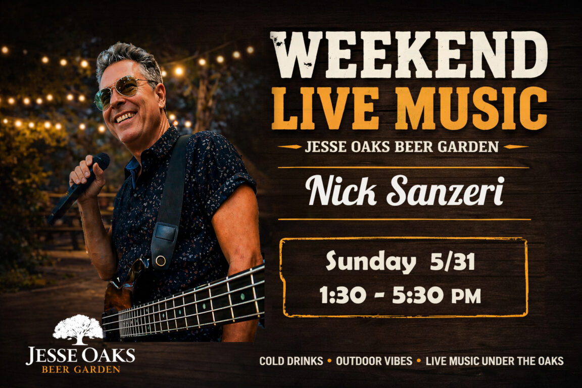 Nick Sanzeri is back at Jesse Oaks this Sunday, 5/31, from 1:30 PM to 5:30 PM in the Beer Garden! He’s played here before, and we’re excited to welcome him back for another great afternoon of live music, cold drinks, and good vibes under the open sky. Stop in early for breakfast, or kick things off with one of our HD Bloody Marys. Bring your crew, bring your appetite, and yes, bring the dogs too, because the Beer Garden is dog friendly.