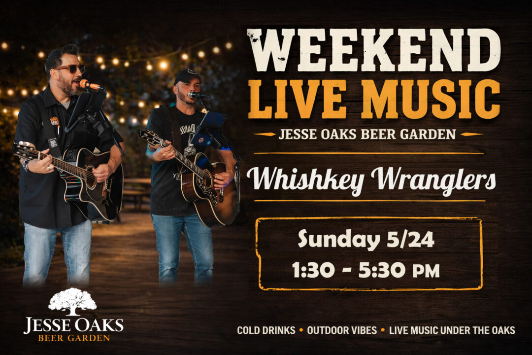 🤠🎶 Live Music at Jesse Oaks! 🎶🤠 Join us Sunday, May 24th from 1:30 PM to 5:30 PM for The Whiskey Wranglers, formerly known as the Brian Daniels Duo! This high-energy acoustic duo features the talented Brian Daniels and Nick Mungari, bringing big sound, great songs, and a lively afternoon to the Beer Garden. Cold drinks flowing, great food nearby, and the perfect soundtrack for your Saturday. Come early, stay late, and soak up the summer vibes at Jesse Oaks. 🍻☀️